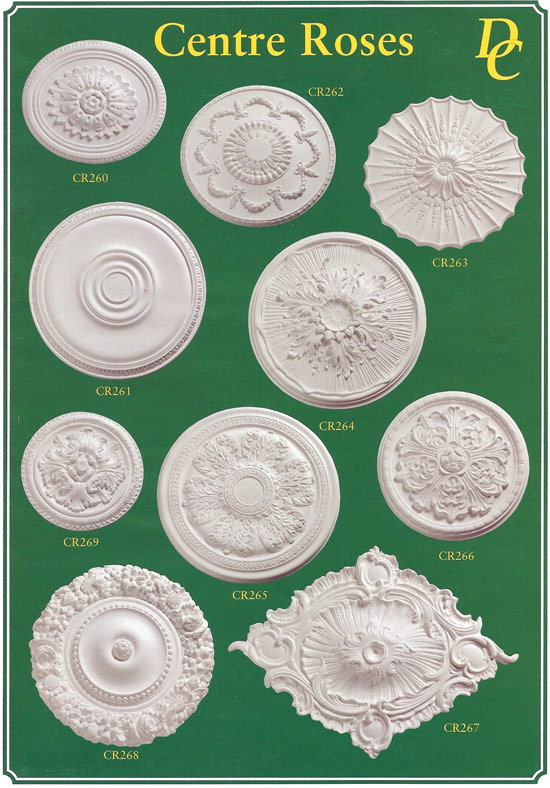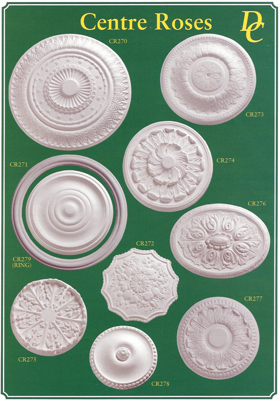 A selection of ceiling centres in different shapes and sizes. Any bespoke ceiling rose can be made to any style or design to suit customers requirements.![]() Make a great impact in the centre of any room. Many matching cornices and other mouldings we manufacture. ![]() |