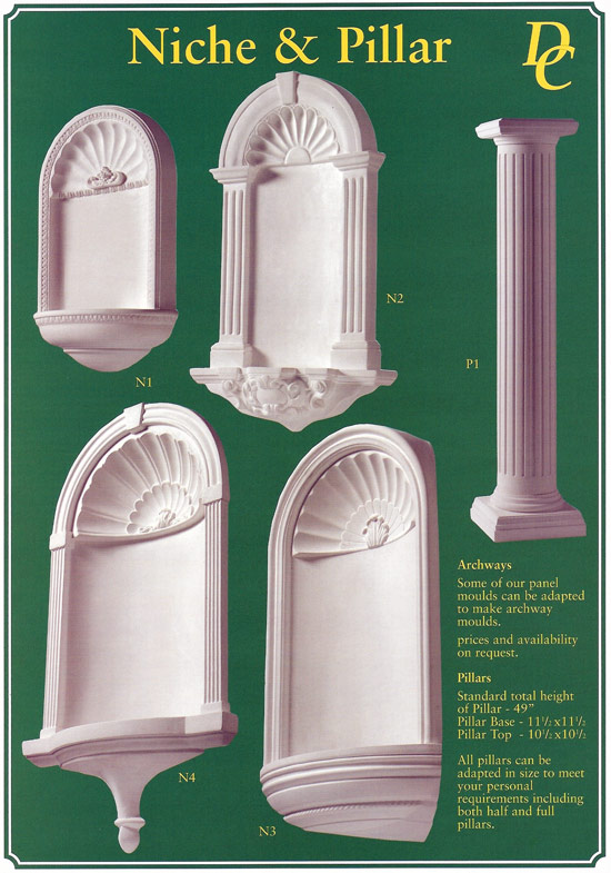 Selection of niches. Inset, corner and flat wall. Pillars, Columns and pilasters all made to required shapes and sizes. Archways can be made to any shape and size. |