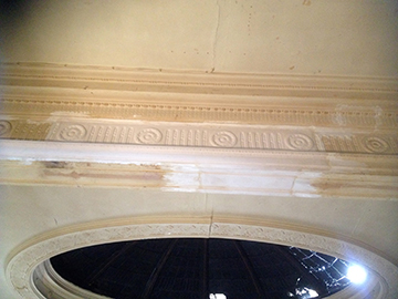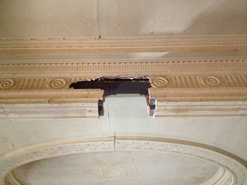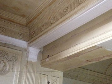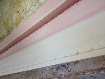 Three pictures that Show the damaged cornice that had been chopped through years ago. Templates were taken, moulds made in our workshop, then fully restored the area, making good matching exsisting ready for decoration. |