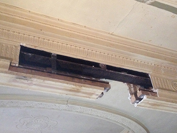 Damage to the ballroom bar area. Moulds and squeezes were taken on site the cornice was made and fitted then the enrichment was inlaid. The enriched under beam panel was also fitted to a plain beam in the same area with a plain moulded edge to balance things out. |