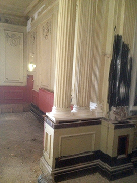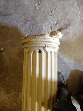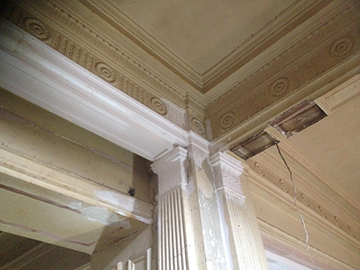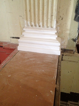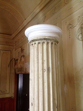 Central pillars were taken down years ago and were badly damaged. The pillar bases and tops were virtually non existent, but just enough to take a template to remake. All four pillars were repaired and caps and bases attached. The pillars when repaired and re-fitted, put the finishing touch to the beautiful ballroom. |