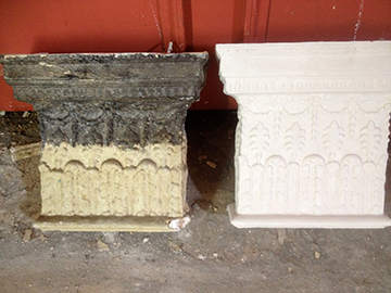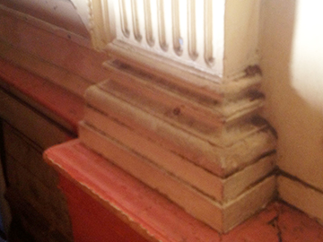 Left: shows the before and after cleaning. Taking the only decent pilaster cap off and taking off all the years of paint. Repairing where required, moulding, making, and supplying and fixing of six caps making good ready for decoration. |