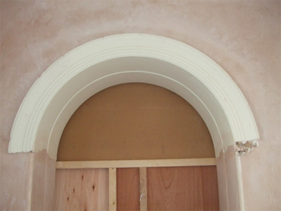 Left: The two pictures to the left show before and after the renovation. The mouldings with beautiful lines enhance the sandstone archway. Again the mould was taken from the original archway, manufactured and fitted making good ready for decoration. |