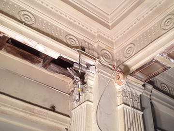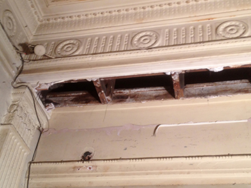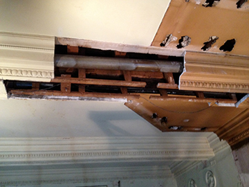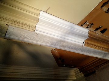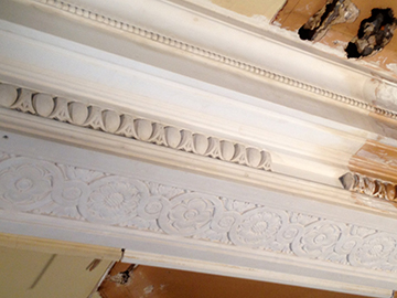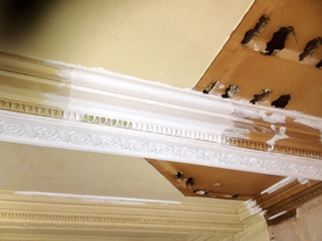 Three pictures that Show the damaged cornice that had been chopped through years ago. Templates were taken, moulds made in our workshop, then fully restored the area, making good matching exsisting ready for decoration. |