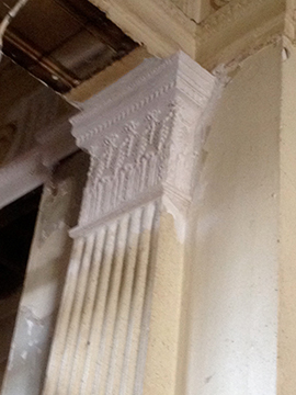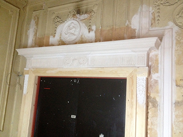 Left: shows the before and after cleaning. Taking the only decent pilaster cap off and taking off all the years of paint. Repairing where required, moulding, making, and supplying and fixing of six caps making good ready for decoration. |