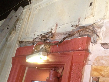 Damage to the ballroom bar area. Moulds and squeezes were taken on site the cornice was made and fitted then the enrichment was inlaid. The enriched under beam panel was also fitted to a plain beam in the same area with a plain moulded edge to balance things out. |