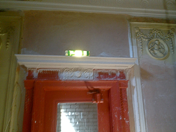Left: shows the wall repaired, re-rendered and plastered by ourselves and the plain overdoor top moulding fitted as per original. Plus another wall panel repair. |