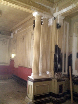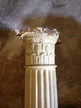 Central pillars were taken down years ago and were badly damaged. The pillar bases and tops were virtually non existent, but just enough to take a template to remake. All four pillars were repaired and caps and bases attached. The pillars when repaired and re-fitted, put the finishing touch to the beautiful ballroom. |